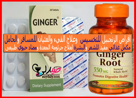 جنجر أقراص وكبسولات Ginger للتخسيس مكمل غذائي لزيادة نمو الشعر ونضارة البشرة ومسكن للآلام ومضاد حيوي لعلاج القيء والغثيان والدوار وجرثومة المعدة دواعي وموانع الاستعمال والآثار الجانبية والجرعة والتداخلات الدوائية والسعر في