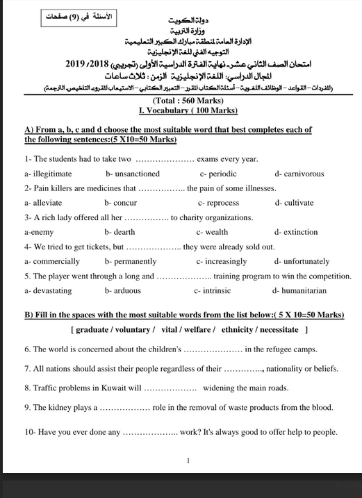 نموذج امتحان تجريبي لغة إنجليزية للصف الحادي عشر ثانوية عبد الله الأحمد الصباح 2018 2019 مدرستي الكويتية