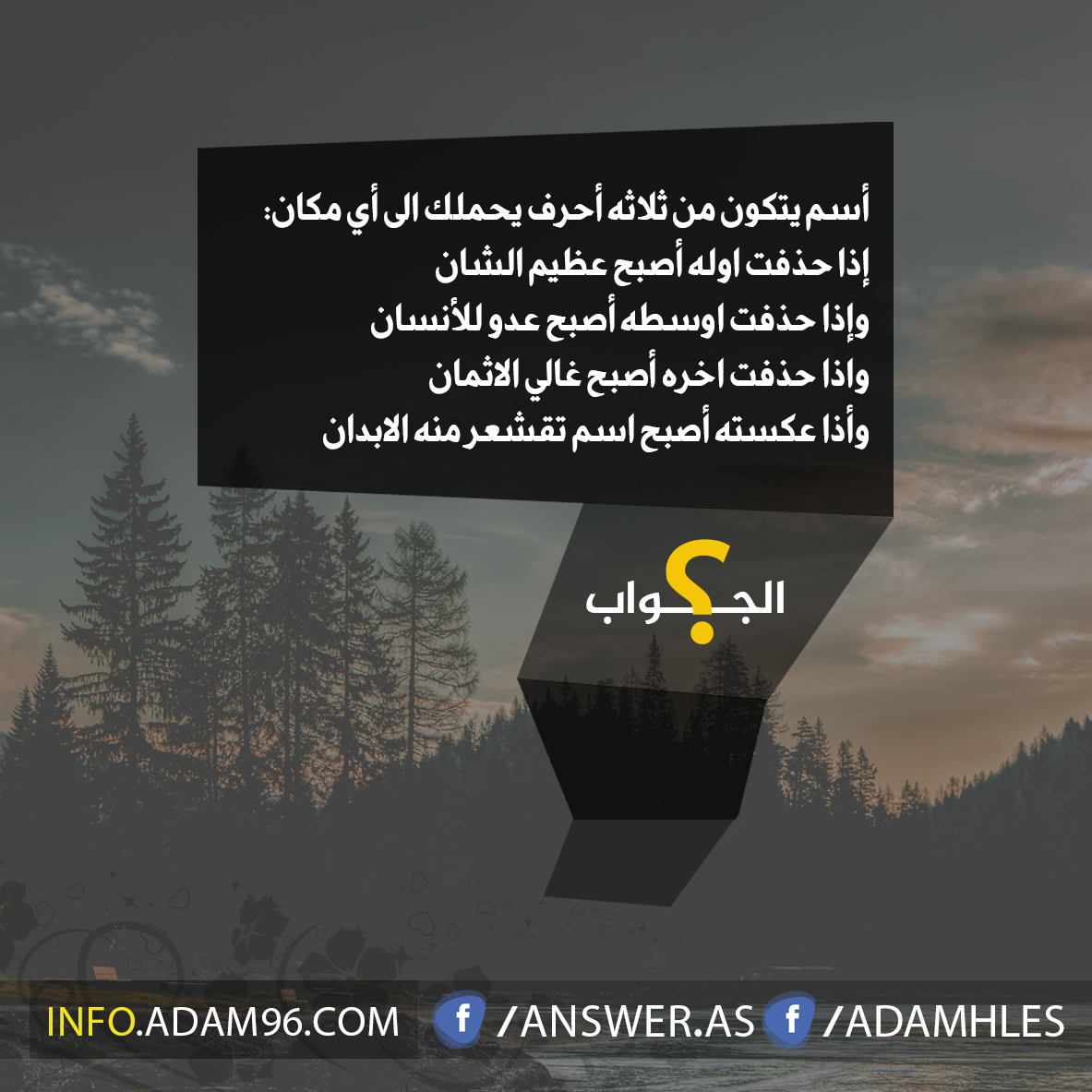 شي من ثلاثه حروف يوصلك إلي مكان إذاحذفت أوله أصبح عظيم الشآن وإذاحذفت أوسطه أصبح عدوالإنسان وإذاحذفت آخره أصبح غالي الأثمان واذاعكسته تقشعرمنه الأبدان فماهو Ask Fm Mrmgrm