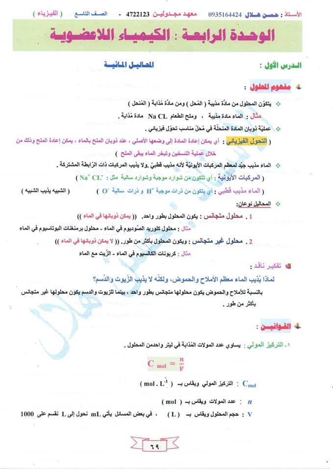 حل اسئلة درس المحاليل المائية في الكيمياء للصف التاسع