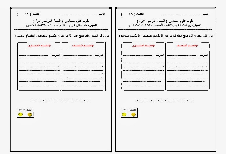 مدونة انجازات تقويم علوم سادس المهارة المقارنة بين الانقسام المنصف والانقسام المتساوي